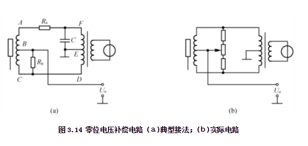 圖3.14(a )示出了,上述原理的典型接法。圖中R用來減小基波正交分量,作用是使線圈的有效電阻值趨于相等,大小約為0. 1~0.50,可用康銅絲繞制。Rb用來減小二、三次諧波,其作用是對(duì)某-線圈(接于A、B間或B、C間)進(jìn)行分流,以改變磁化曲線的工作點(diǎn),阻值通常為幾百~幾十kQ。電容C用來補(bǔ)償變壓器次級(jí)線圈的不對(duì)稱,其值通常為100~500PF。有時(shí)為了制造與調(diào)節(jié)方便,可在C、D間加接-電位器R,利用R與Ra的差值對(duì)基波正交分量進(jìn)行補(bǔ)償。圖(b)示出了一種傳感器的實(shí)際補(bǔ)償電路。